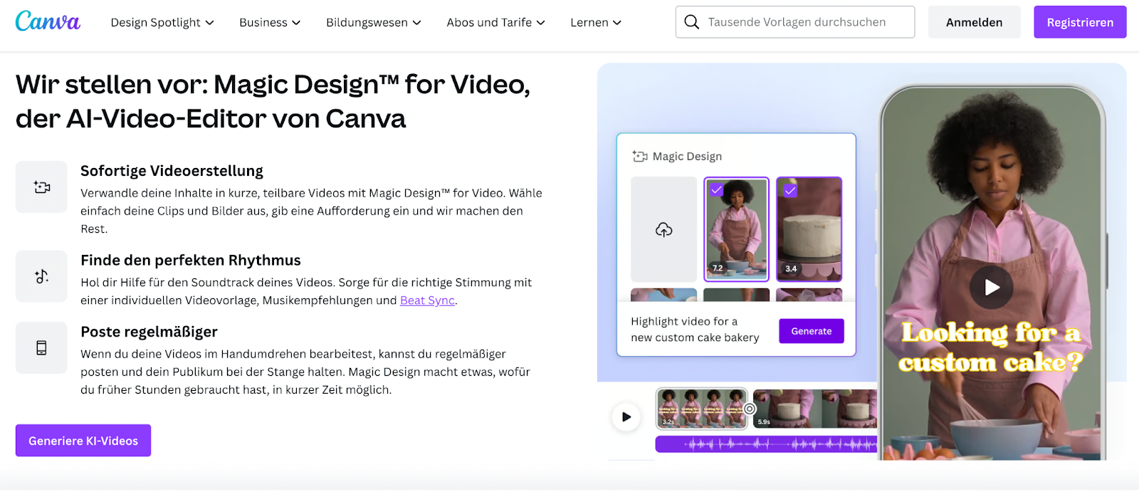 Kommen wir zu einem Tool, über das wohl jeder Influencer schon einmal gestolpert ist – Canva, einer beliebten Bearbeitungsapp für Bilder, Videos und vielem mehr, die mit unzähligen Vorlagen daherkommt. Mit „Magic Design“ bietet Canva seinen eigenen KI-gestützten Videoeditor. Egal, ob TikTok-Videos oder YouTube Shorts – Canva spuckt Dir in Sekunden die passende Vorlage aus und verpasst Deinem Video den letzten Schliff. Alles, was Du tun musst, ist ein Video hochladen und eine Aufforderung eingeben – schon wird Dein Videomaterial bearbeitet.