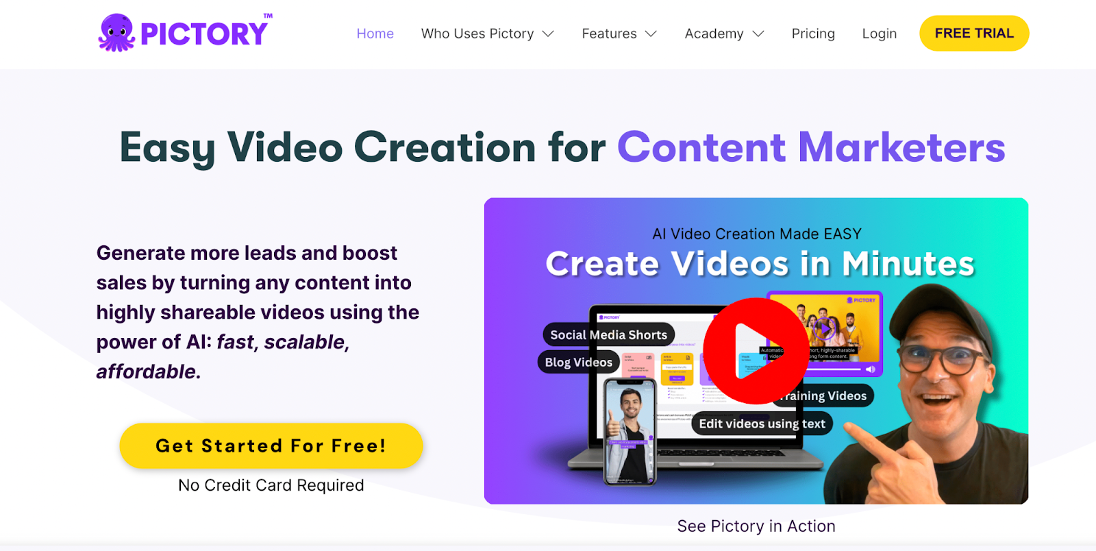 Den Beginn unserer Liste macht Pictory, ein AI-Videoeditor, der eigenständig die besten Elemente Deiner Longform-Inhalte extrahiert und in hochwertige Videos umwandelt. So kannst Du mit der Software beispielsweise textbasierten Content wie Artikel, Skripte und Blogbeiträge für Deine Videos verwenden. Als Input-Quelle musst Du lediglich einen Link einfügen. Pictory kombiniert Deinen Content dann mit Stock-Videos, Bildern, Musik und Texten. Dabei kannst Du auf eine Bibliothek mit mehr als 3 Millionen lizenzierten Stock-Inhalten zurückgreifen.