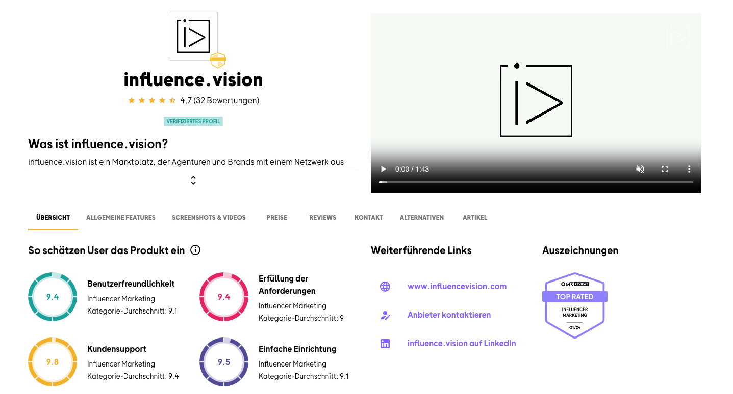 Die Badges sind vergleichbar mit einem Gütesiegel. Sie zeigen an, dass ein Produkt oder eine Dienstleistung getestet und gute Ratings erhalten hat. Im Fall von influence.vision bedeutet das Top Rated Influencer Marketing Tool, dass wir in den letzten drei Monaten mindestens zehn gute Bewertungen erhalten haben. Das weist die User der Plattform daraufhin, dass wir zu den Spitzenreitern im Bereich Influencer Marketing gehören, da das Badge nur die neuesten Bewertungen berücksichtigt.