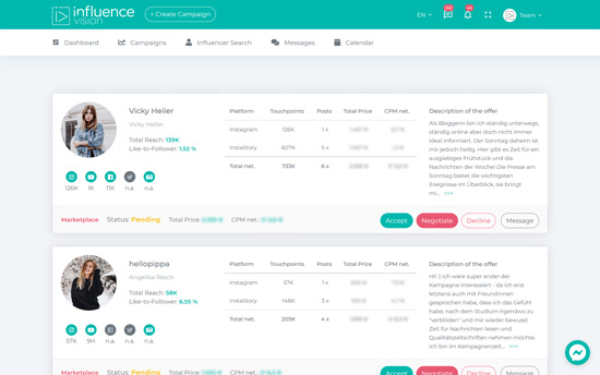 Agentur, Plattformen oder direkte Kooperation – Influencer Agenturen übernehmen die meisten Deiner Aufgaben der Kampagne, jedoch mit hohen Provisionen. Um Geld zu sparen, kannst Du nach Influencern in Social Media suchen und den Vertrag selbst aushandeln, was jedoch zeitaufwendig ist und viele Ressourcen in Anspruch nimmt. Die beste Alternative ist die Registrierung auf einer Influencer Marketing Plattform (auch Influencer Marktplatz genannt) wie der von influence.vision. Dort hast Du die Möglichkeit, Deine eigene Kampagne mithilfe unserer Tools zu verwalten oder unser Expertenteam mit der Leitung Deines Projekts zu beauftragen. Das spart Kosten und Du wirst in den gesamten Prozess eingebunden.